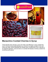 Maraschino Cocktail Cherries in Syrup These beautiful dark cherries in syrupwill make a big difference in every cocktail they touch. All-natural wholepitted Marasca sour cherries, are slightly candied in their own juices withsugar. Amifruit perfected the cocktail cherry, transforming it from a garnishto an essential ingredient. Just one cherry in a cocktail will elevate anordinary cocktail into something quite special.